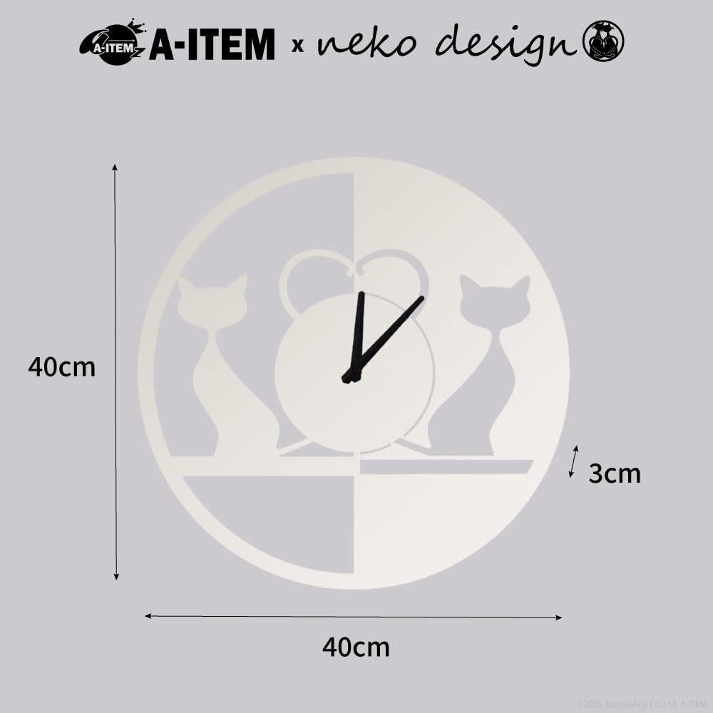 A-ITEM × neko design 壁掛け時計 猫デザイン 直径40cm (ホワイト)